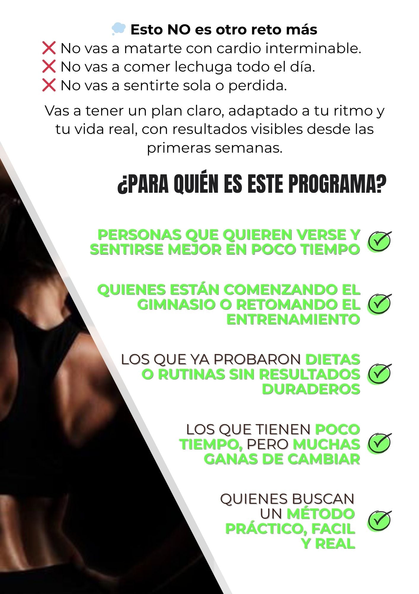 No. Está pensado para cualquier persona que quiera empezar con el cambio de sentirse mejor, comer más saludable y mantener una rutina sencilla de ejercicios y sin restricciones extremas.
