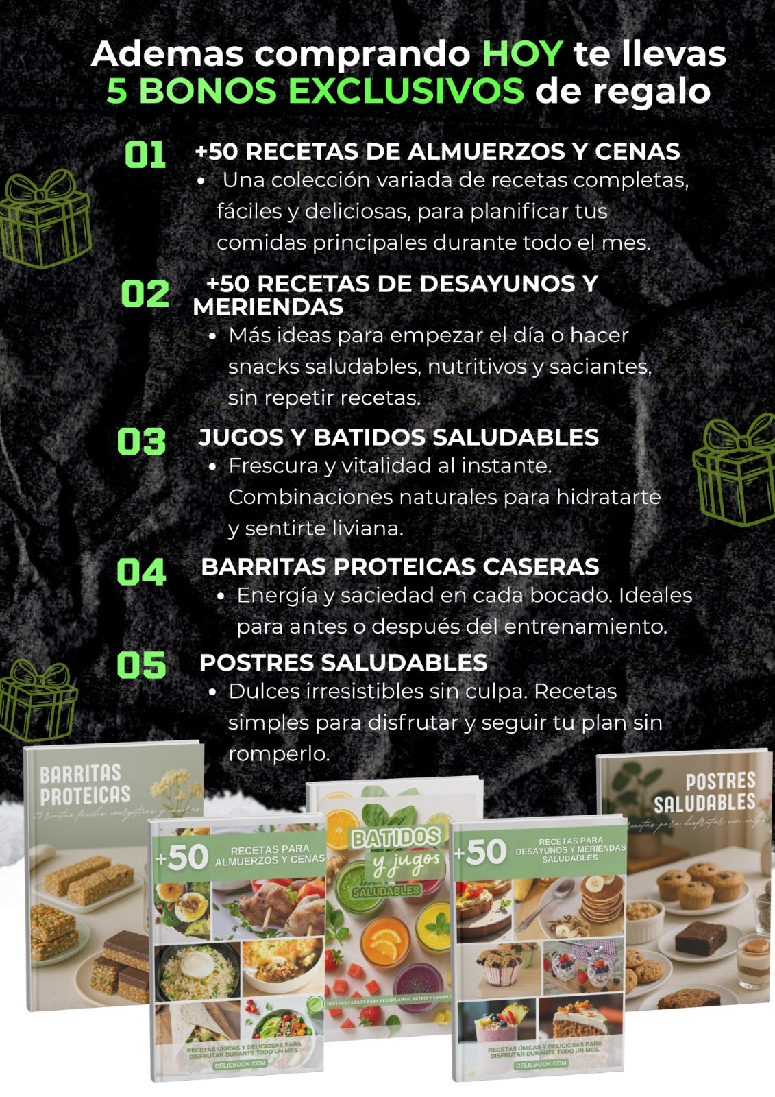 Recibís todo junto en un solo correo: el ebook principal + los 5 bonos descargables.